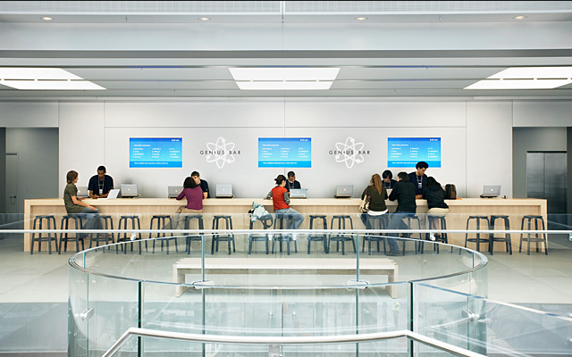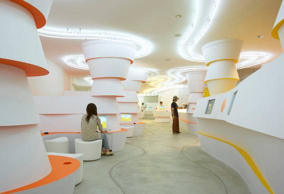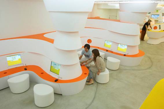 Au premier étage se trouve l'espace Lounge, conçu pour être "rafraîchissant et relaxant". Installés dans des banquettes en cuir, les clients peuvent commander sur le thème du "mix and match" tout en regardant défiler les différentes collections sur un écran plasma géant.